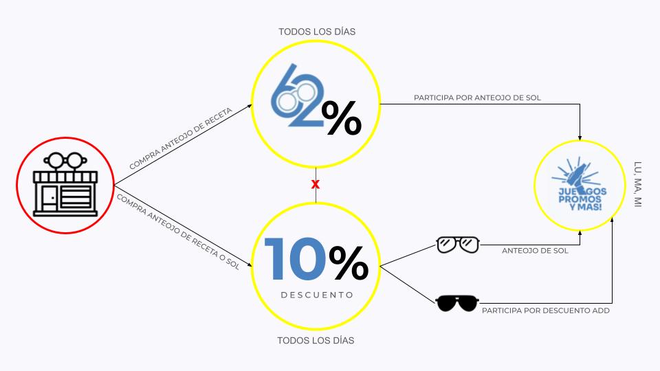 Compra de un anteojo de receta (con o sin la Promo 62%): el cliente participa automáticamente y, si la botella cae parada, gana un anteojo de sol seleccionado sin cargo el mismo día.